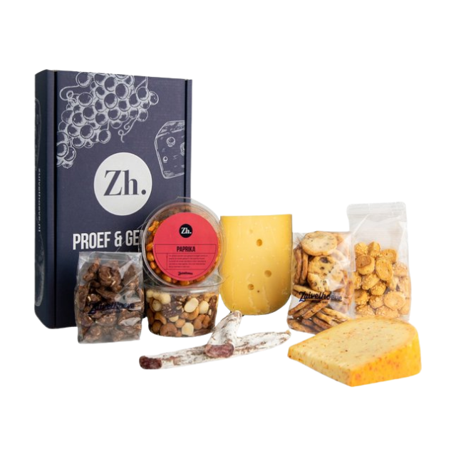 Dit zorgvuldig samengestelde pakket bevat een mix van hartige en zoete producten, ideaal voor een borrelavond, als cadeau of gewoon om jezelf te verwennen.